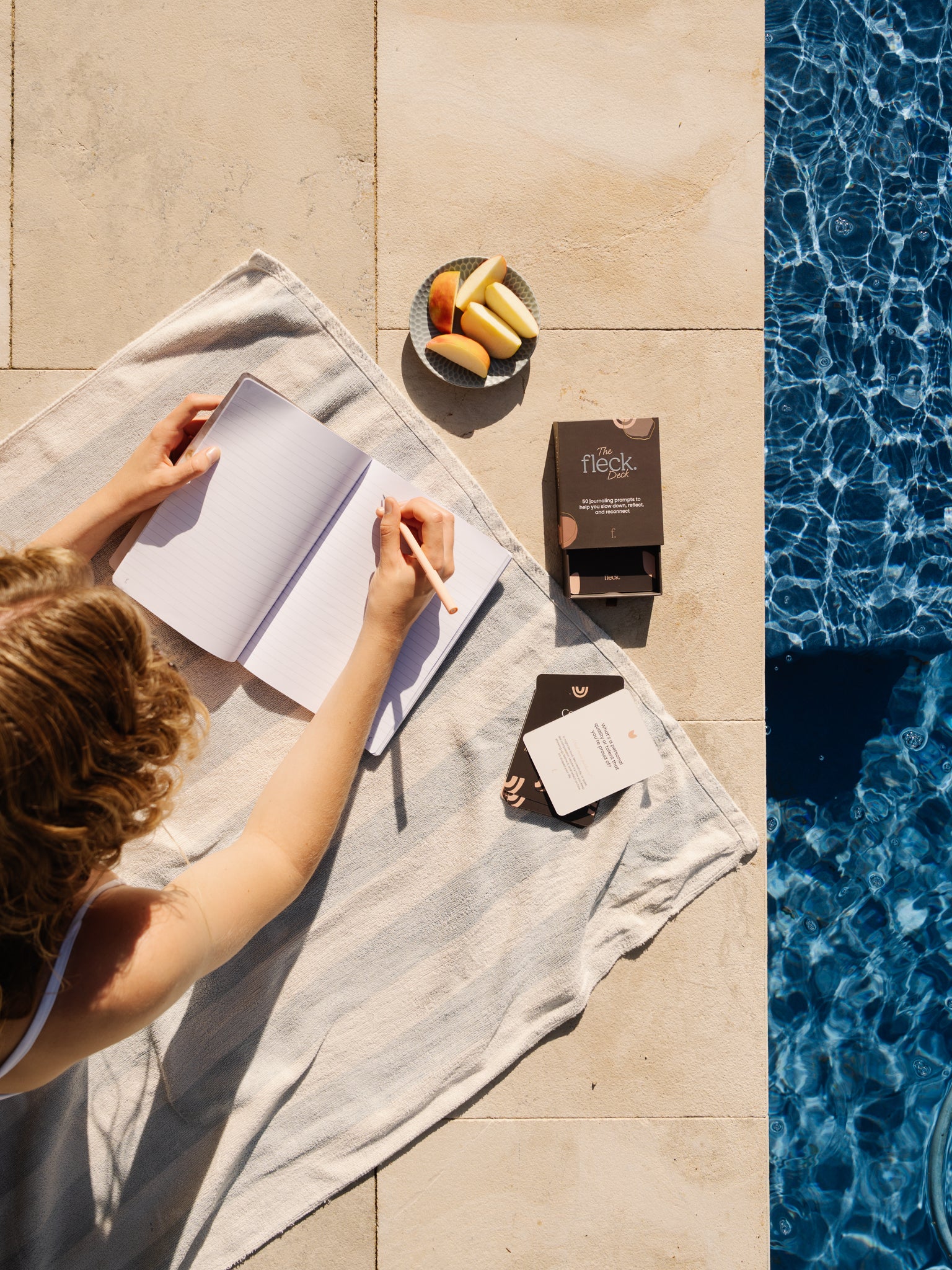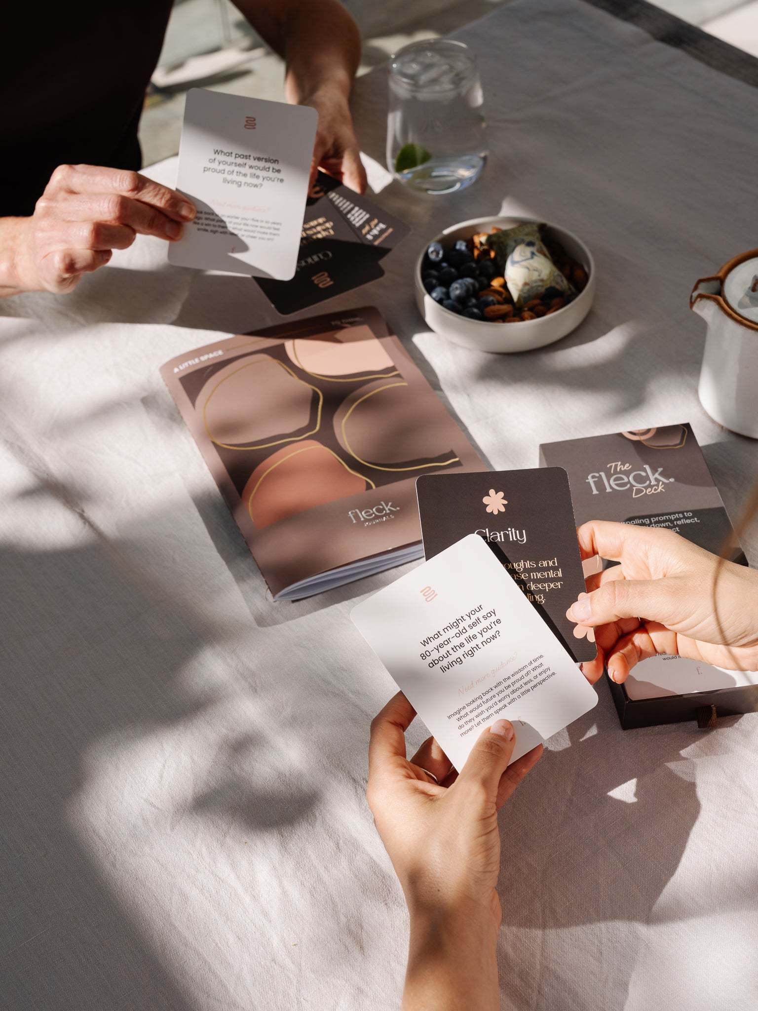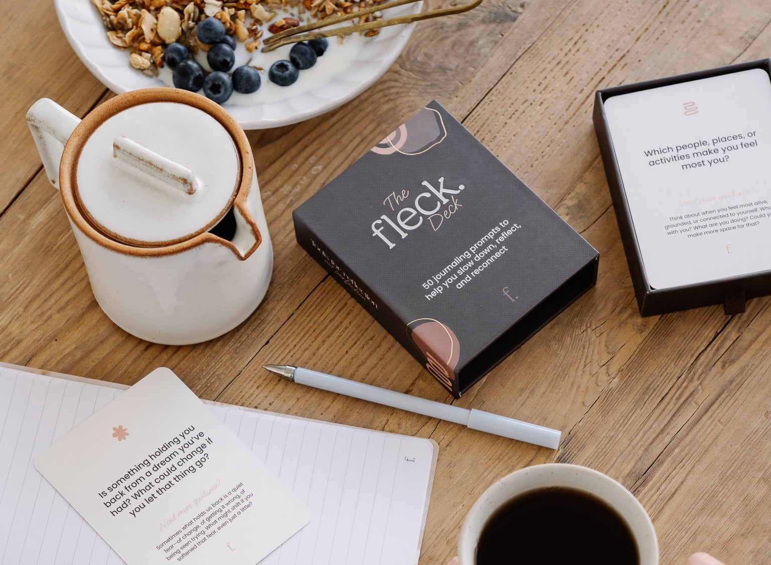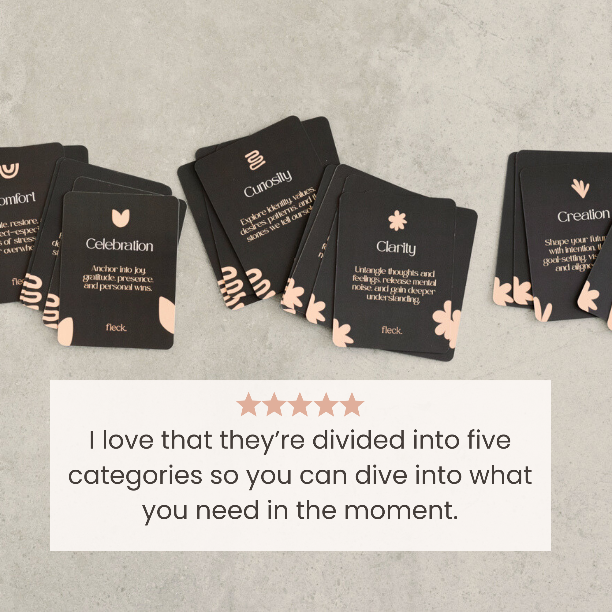 - The Fleck Deck: 50 journaling prompts across five themes – Clarity, Curiosity, Creation, Celebration, and Comfort – so you can choose what you need in the moment.